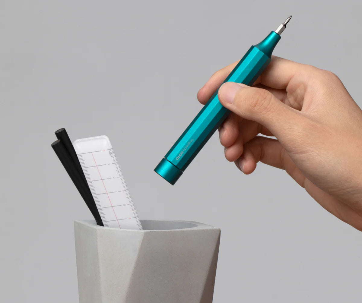 The pen-like case hides a removable backbone that neatly stores 12 double-ended bits, all magnetically attached to the precision screwdriver. Take and place bits with a simple "click".