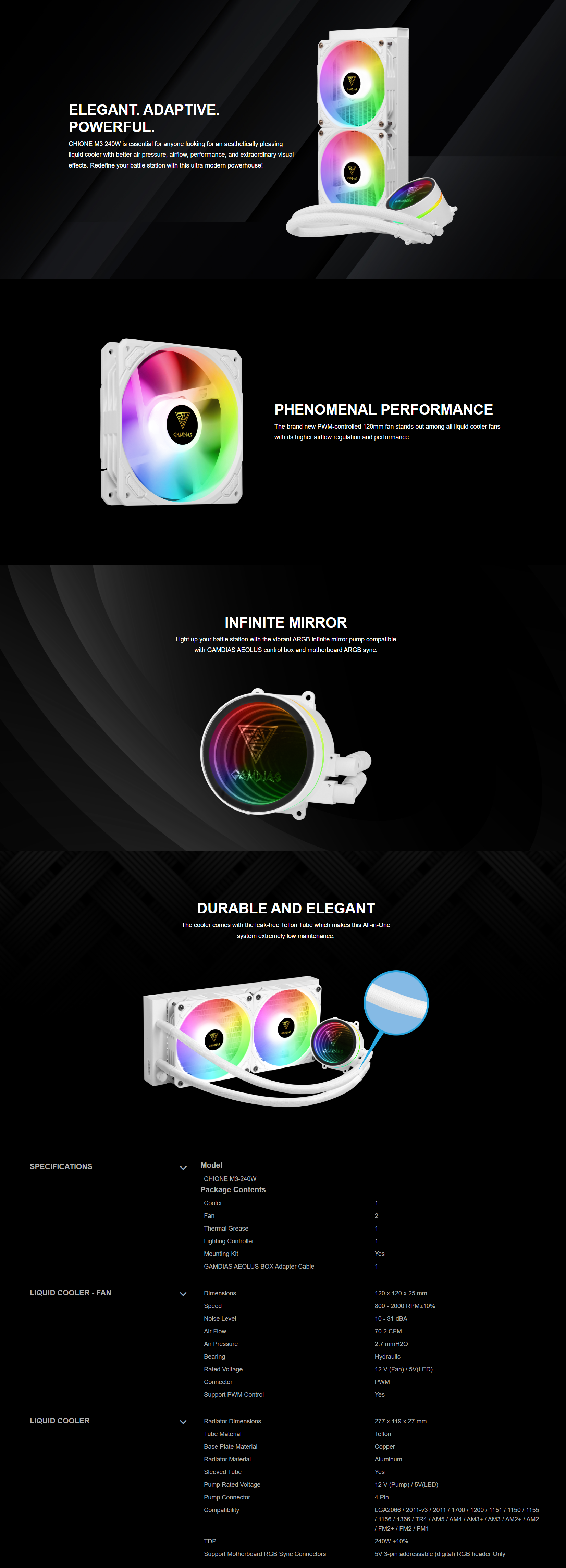 Package Contents:Cooler x1, Fan x2, Thermal Grease x1, GAMDIAS AEOLUS BOX Adapter Cable x1, Mounting Kit