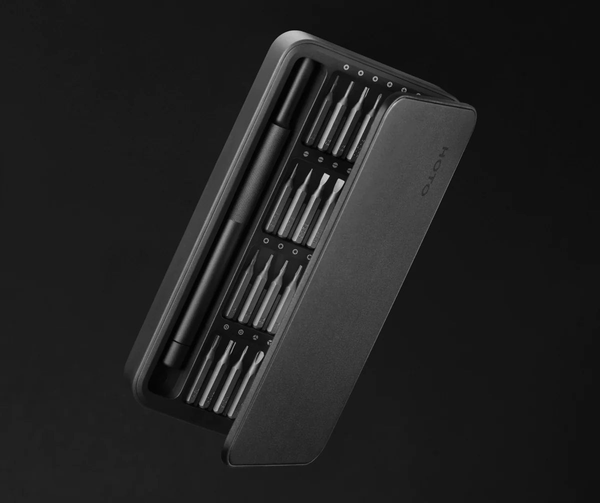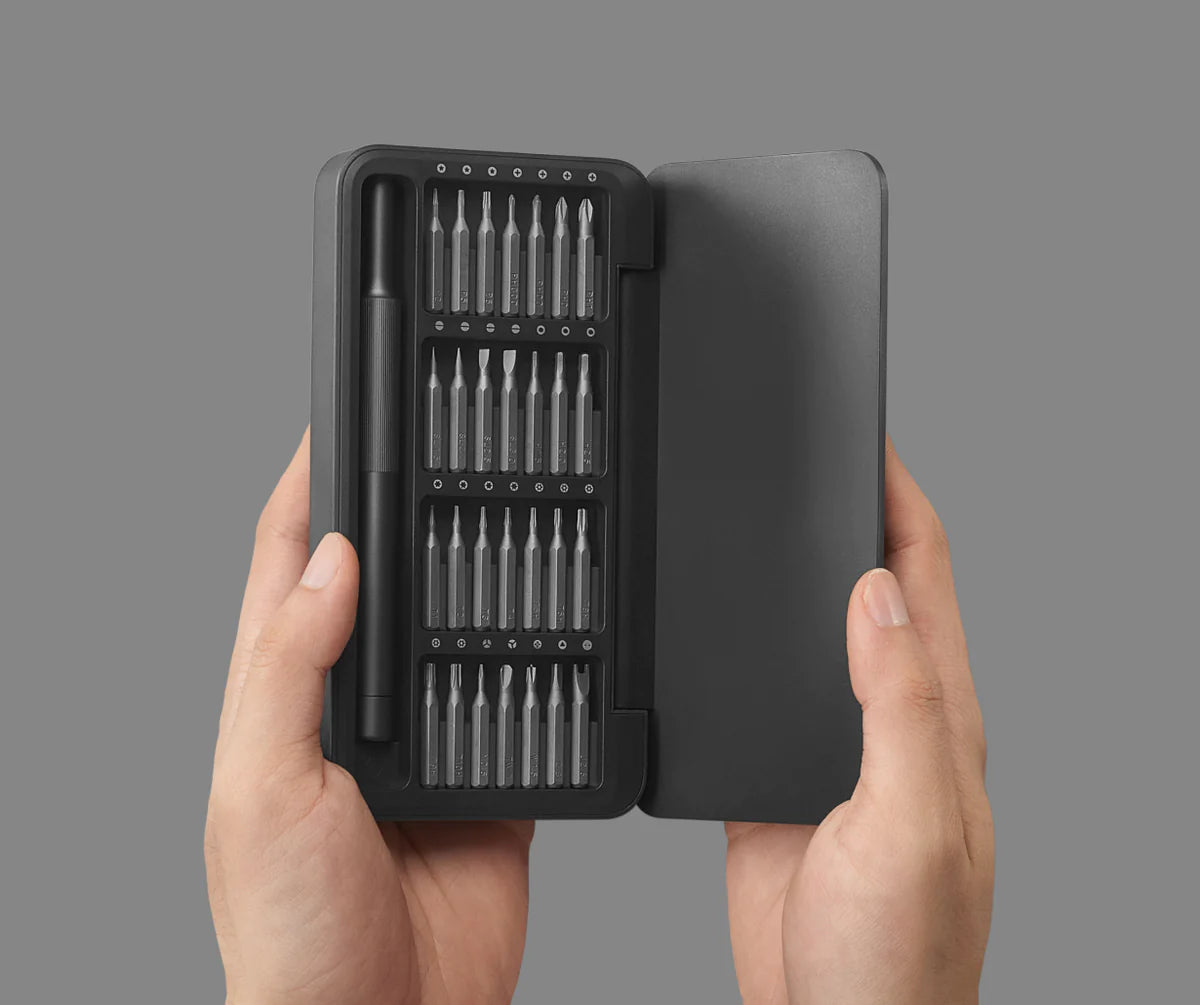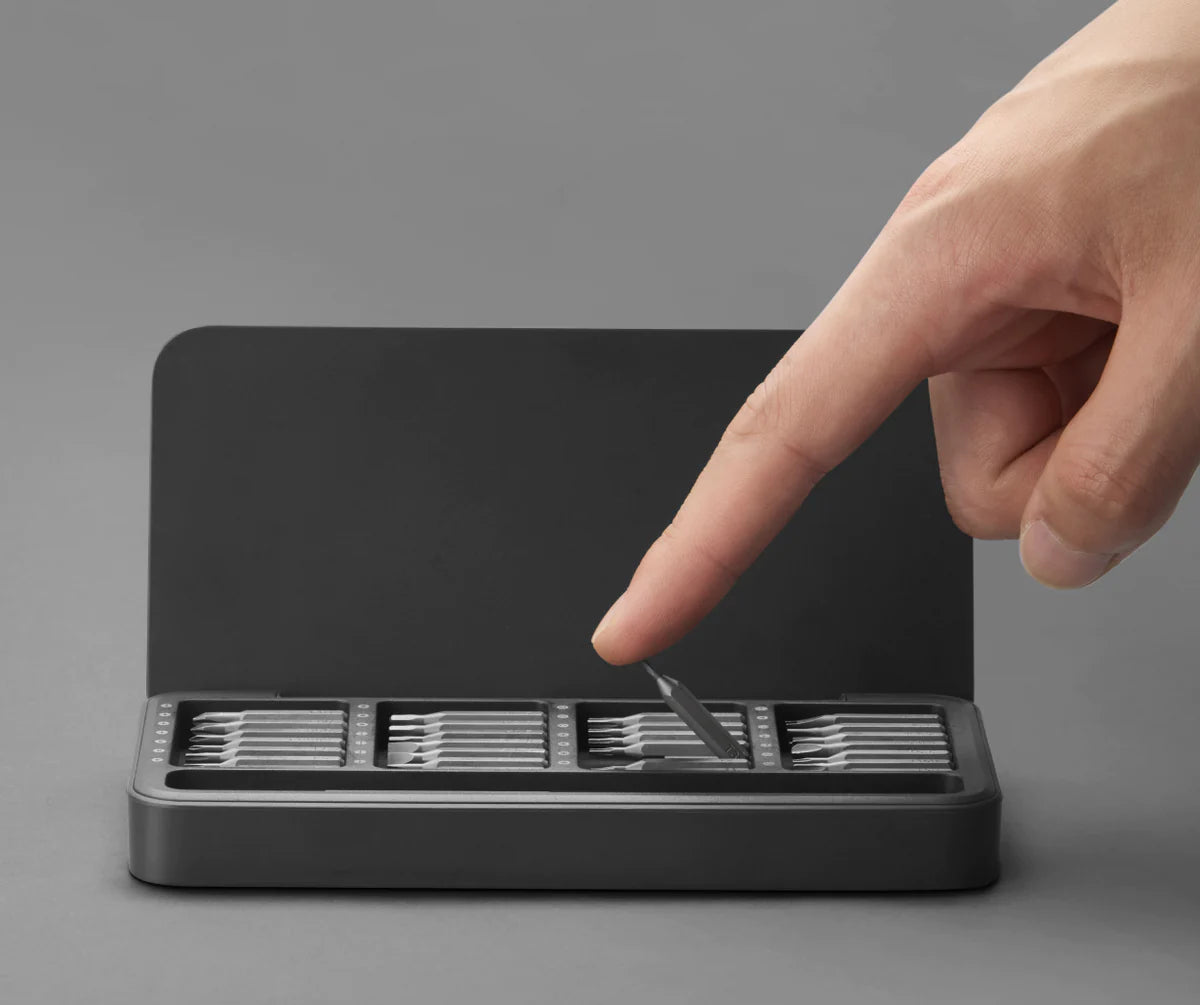 Compact and aesthetic screwdriver set that offers a space-saving and lightweight solution (230g), comparable to a typical cellphone.