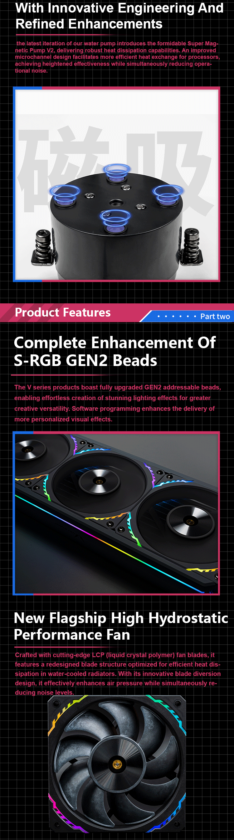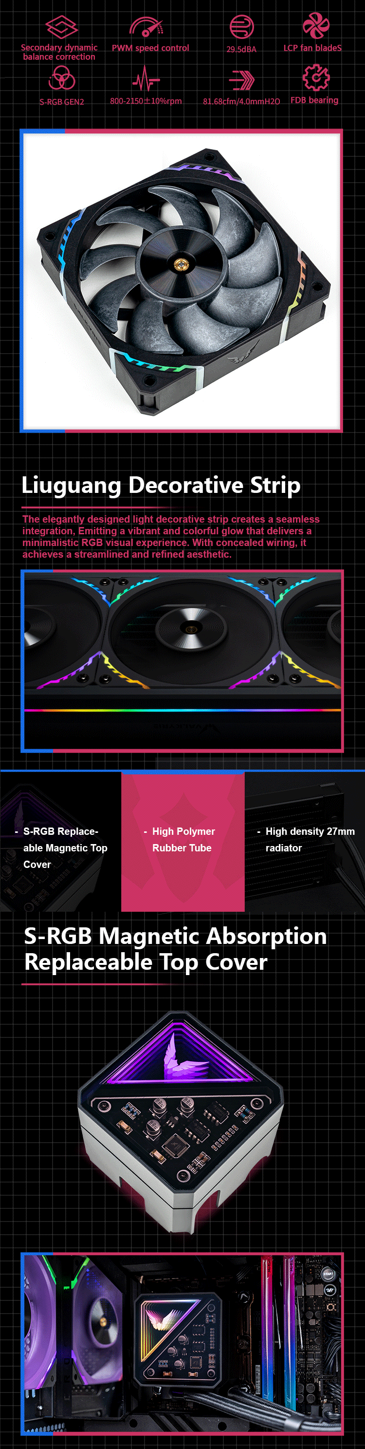 The Valkyrie V360 is an all-in-one powerhouse of liquid CPU cooling. Featuring an LCD screen, it brings sophistication to your setup with its unique look and powerful performance.